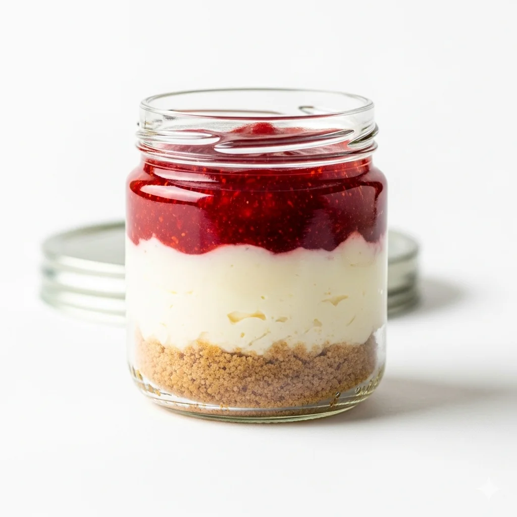 Uma deliciosa combinação de farofa de biscoito amanteigado, creme cheese ao leite e cobertura de geleia de morango artesanal
